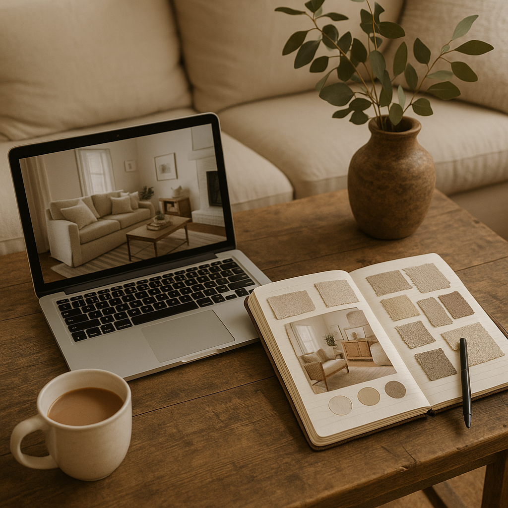 This is where the vision starts to take shape. After we’ve talked through your style and gathered inspiration, I create a mood board of colors, textures, and pieces that reflect you. It’s laid-back and visual—like flipping through a scrapbook of what your space could become.