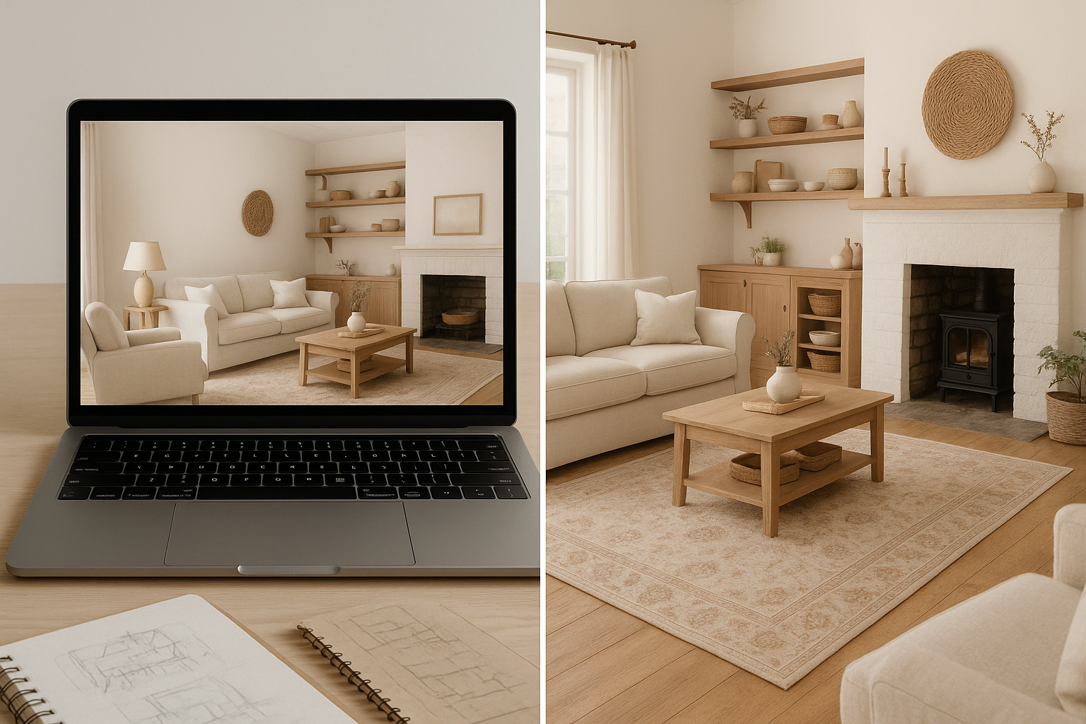 From there, I sketch ideas by hand and map out a floor plan that shows how everything fits together—how the light flows, how the room breathes, and how each piece finds its place. We’ll review it together, make any tweaks, and ensure it feels just right before moving forward.
